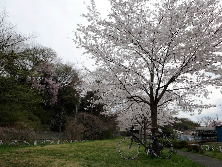 ふだん通る、とある川沿いの道の、対岸からちょっと裏道に入ったところにある桜。まぁ、桜を眺めようと思って寄り道したのではなくて、なんとなく寄り道したら桜の木があった……というのが正解ですが、せっかくなので自転車を止めてしばし眺めることに。実は「向こう岸」はほとんど通らないので、公園があることは知っていましたが、こんなふうに桜が植わっていることは知りませんでした。比較的近所と言えるエリアでも、まだまだ発見があります。