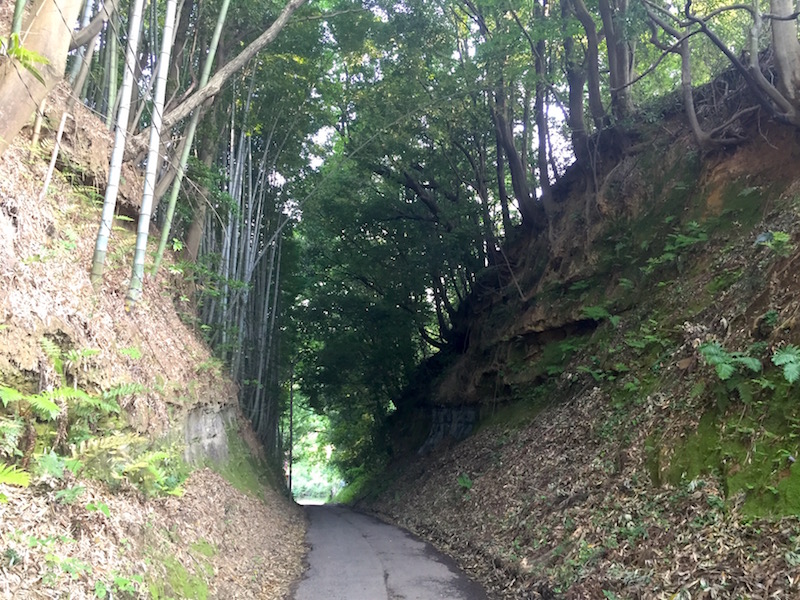 横浜市にある「寺家ふるさと村」と、町田市の三輪を結ぶ細い道。地域の境目となる坂の頂上部は、立派な切り通しになっています。