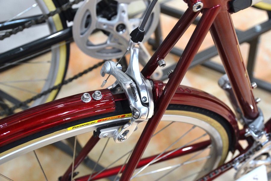 2016年モデルまでは、ブレーキがカンチでした。現代のクラブモデルは太めのタイヤや泥除けに対応するために、カンチブレーキが採用されることが多いのです。しかし2017年モデルのClub Specialでは、往年のデザインを再現し分割機能も備えたフェンダーを新たに採用したことで、ブレーキがシマノのロード用になりました。