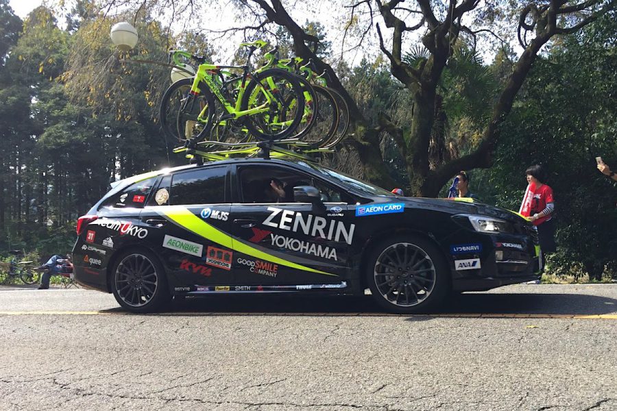 ジャパンカップでは、選手のみならず関係車両にも沿道から声援が送られます。