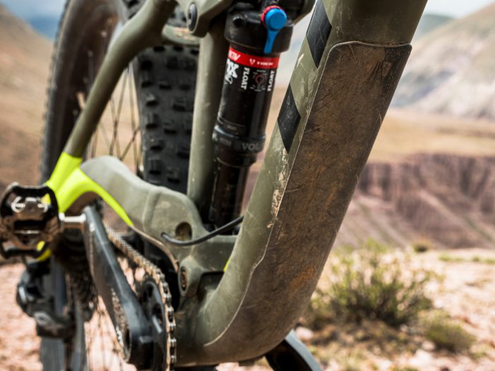 29×3.0と大径で太いタイヤを装備。そして前後サスペンションは130mmトラベルとなっています。タイヤとフレームのクリアランスを確保し、ペダリング効率に優れた機敏な走りを実現するために、エレベーテッドチェーンステーとなっているのも大きな特徴です。