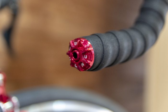 ベースとなるのは、アルミフレームのレーサー「FR30」。ヘッド周りやハンドル周り、ペダル、ケーブル類などに、KCNCのカラーパーツを存分に投入。大胆な肉抜きや美しいアルマイト加工が施されたパーツ類は、眺めていても楽しいものです。