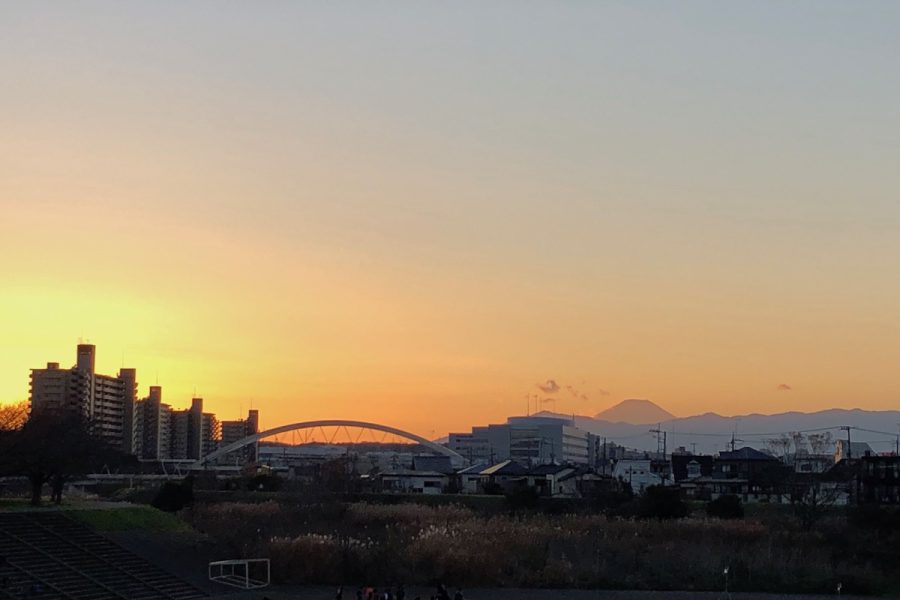 食べ終わって片付けをしたら、まさに日が沈もうとしていました。富士山がきれいに見えます。